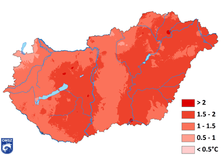 Mindenhol melegebb volt a megszokottnál: a legtöbb területen +1-2°C-os anomália adódott az 1971-2000 közötti átlaghoz képest, melyet 2. ábránk szemléltet; északnyugaton és az Északi-középhegységben azonban elvétve találunk +0.5°C alatti eltéréseket is. Az adott területen megszokott viszonyokhoz képest Tokajban, Szegeden, Dunaújváros mellett és Zirc környékén volt a legnagyobb az eltérés, itt több mint 2°C-kal melegebb volt az ősz a normálnál.