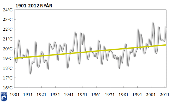 Az elmúlt 112 év középhőmérsékleteit tekintve (4. ábra) a 2012-es nyár kiugró értéket képvisel, az idei a 2003-as nyár mögött a 2. legmelegebb volt 1901 óta. Az évekhez illesztett trendvonal lassú emelkedést jelez.