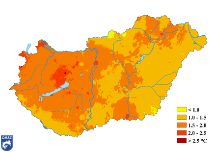 Az 1971-2000-es átlaghoz viszonyítva az idei értékeket (2. ábra), hazánk egész területén melegebb volt az időjárás a szokásosnál. Az ország legnagyobb részén 1-2°C közötti pozitív anomália adódott, ennél nagyobb eltérés az északnyugati határ közelében, a Bakonyban és még néhány kisebb területen rajzolódott ki.