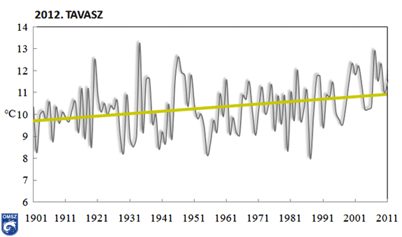 Az 1901-től kezdődő idősorban az idei tavasz a 9. legmelegebb lett (I. táblázat). Az adatokhoz illesztett lineáris trend alapján lassú emelkedést figyelhetünk meg az elmúlt 112 év tavaszi középhőmérsékleteiben (4. ábra).