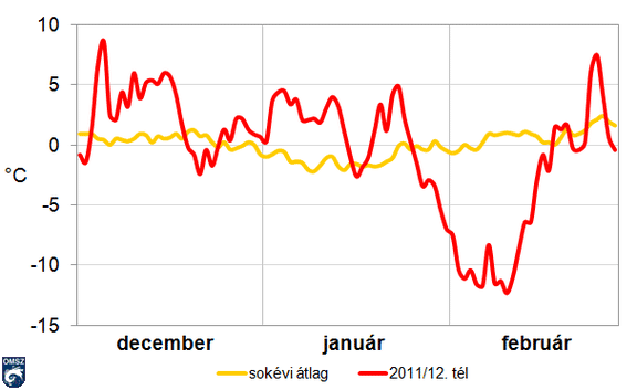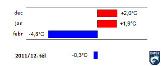 A havi átlaghőmérsékletek az évszak első két hónapjában átlag fölöttiek voltak, az anomália mind januárban, mind februárban mintegy +2 °C volt (3. ábra). Februárban viszont közel -5 °C-os eltérés jelentkezett országos átlagban, mely egymaga meghaladta az első két hónap pozitív különbségeit. Ennek megfelelően, ugyan kismértékű, de negatív évszakos középhőmérsékleti anomália adódott, az 1971-2000-es átlaghoz képest mintegy 0.3 °C-kal volt hidegebb az 2011/12-es tél.