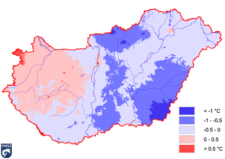 A fenti hőmérsékleti értékek az ország javarészében közel átlagosnak bizonyultak, a 2. ábra hőmérsékleti anomáliatérképén nagy területen rajzolódott ki -0.5 és +0.5 °C közötti hőmérsékletű terület. A szokásosnál valamivel melegebb volt Sopron környéke, míg az átlagnál 1 °C-kal vagy még annál is hidegebb régiók jelentek meg a Duna-Tisza közén, illetve a délkeleti országrészben.