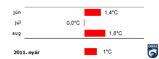 Nem csak a nyár, hanem az évszak hónapjai is pozitív hõmérsékleti anomáliát mutattak (3. ábra). Ez alól kivételt csupán a július jelentett, amikor az országos átlag gyakorlatilag megegyezett a sokéves átlaggal. Az eltérés augusztusban volt a legnagyobb, ekkor közel 2 °C-kal volt melegebb a szokásosnál.
