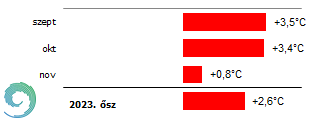 Az évszak középhőmérséklete országosan 13,3 °C, ami 2,6 °C-kal haladja meg az 1991-2020-as normált. A szeptember 3,5 °C-kal, az október 3,4 °C-kal, a november pedig 0,8 °C-kal volt melegebb a megszokottnál. (3. ábra).
