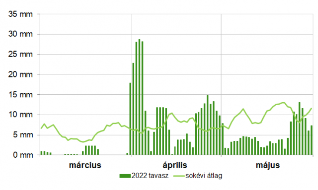 A sokévi átlaghoz viszonyított csapadékösszegek jól mutatják, hogy ez a tavasz szárazabb volt a megszokottnál. A legjelentősebb negatív anomáliát a Tiszántúlon és Bács-Kiskun megye déli részén tapasztaltuk, ahol nagy területen a normál értéknek mindössze 40-60%-a hullott. 2022 tavaszán csupán a Dunántúl déli részén, a nyugati határvidéken, továbbá Bács-Kiskun megye északi részén mérhettük a megszokott csapadékmennyiségeket, az ország többi részén kevesebb hullott a szokásosnál.