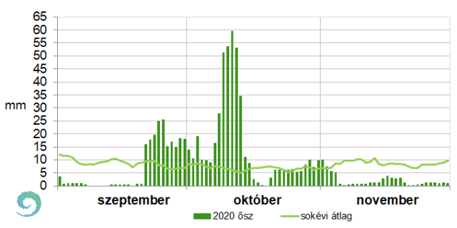 Országos átlagban 2020 őszén 149,9 mm csapadék hullott, ami az 1981–2010-es átlag 102%-a, tehát összességében egy átlagosan csapadékos évszak múlt el, az évszakon belüli eloszlás azonban különösen egyenetlen volt. Szeptemberben a szokásosnál 35%-kal, novemberben 68%-kal kevesebb csapadékot összegeztünk. A november különösen száraz volt, a sokévi érték alig harmada hullott le. Az október viszont nagyon csapadékosnak adódott, mivel az átlag több mint kétszerese, annak 232%-a volt országosan (8. ábra). Az őszi csapadék közel 80%-a szeptember 25. és október 15. közötti, alig három hét alatt hullott le főként az északkeleti országrészben.