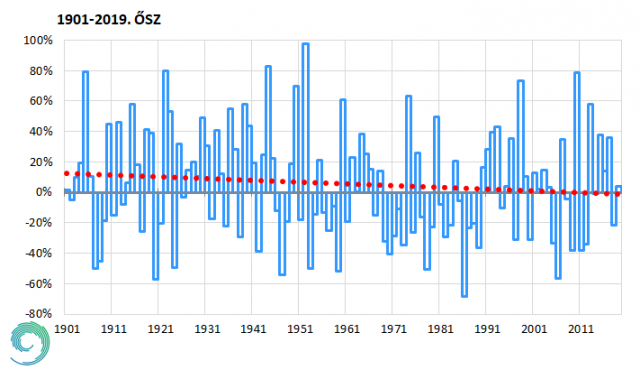 2019 őszének csapadékösszege átlagos, kevéssel az átlag felett alakult (+3%). Az illesztett trend ugyanakkor 1901-től közel 15%-os csökkenést mutat (9. ábra).