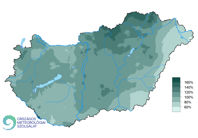 2019 őszén hazánk legnagyobb részén a szokásos csapadékmennyiség 80–120%-a hullott le, de az Alföld északkelti részén néhol az 1981–2010-es átlag 60%-át sem mérték. (7. ábra) A Dunántúl déli tájai a normálnál kissé szárazabban, az északiak kissé csapadékosabban alakultak. Az éghajlati normál 100–120%-a jellemezte az Alföld nyugati felét is. A legnagyobb pozitív anomáliák az Északi-középhegységben fordultak elő, ahol kisebb körzetekben az északi határ mentén (pl. Aggteleki-karszt) az átlag 1,5-szerese is lehullott.