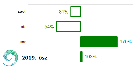 A 2019-es ősz csapadékösszege a sokéves (1981-2010-es) átlag százalékos arányában kifejezve