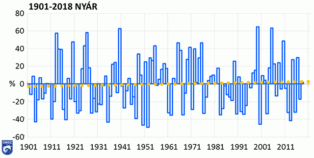 Az országos nyári csapadékösszegek százalékos eltérése a sokéves (1981-2010-es) átlagtól 1901 és 2018 között (interpolált adatok alapján)