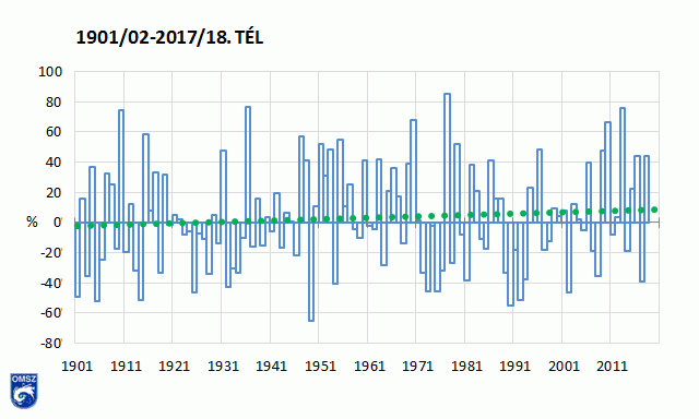 Az országos téli csapadékösszegek százalékos eltérése a sokéves (1981-2010-es) átlagtól 1901 és 2017 között (interpolált adatok alapján)