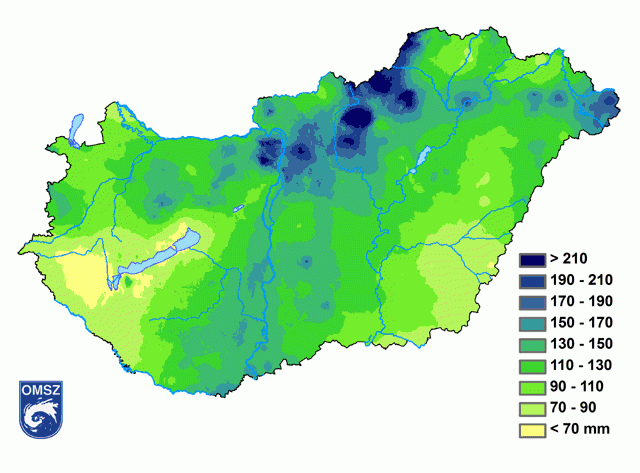 A csapadék térbeli eloszlása változatos képet mutat (6. ábra). A Balaton mentén és a Göcsej területén az évszakos csapadékösszeg a 70 mm-t sem érte el, míg az Északi-középhegység magasabban fekvő területein a háromhavi csapadékösszeg meghaladta a 210 mm-t is. A legnagyobb napi csapadékösszeget, 108,5 mm-t Miskolc Lillafüred-Jávorkút állomáson regisztráltuk április 19-én.