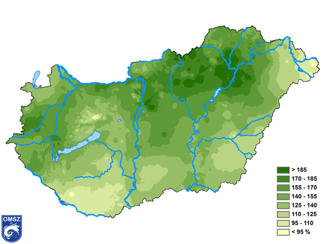 A legnagyobb területeken a megszokott csapadékmennyiség 140-170%-a hullott le hazánkban a tél folyamán. Ennél nagyobb anomáliát az ország ÉK-i területein, valamint ÉNy-on figyelhetünk meg, az átlagosnál alacsonyabb értékek pedig a Mecsek környékén és a Nyírség keleti részén jelentek meg (7. ábra).