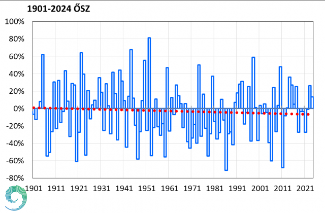 2024 őszén leginkább pozitív anomália jelentkezett csapadék esetén. Negatív eltérés csak kisebb területeken (az Északi-középhegység nyugati részén, valamint a Körös-Maros közén) figyelhető meg; e tájakon a sokéves átlag 80-90%-a hullott. Az Észak-Alföldön, a Bakonyban és a Bodrogközben volt a legnagyobb csapadéktöbblet az évszakban: a megszokottnak a 130-160%-a érkezett. A legnagyobb őszi csapadékösszeget adó állomáson, Bakonybél Somhegypusztán az 1991-2020-as normál 170%-át mértük 2024-ben.