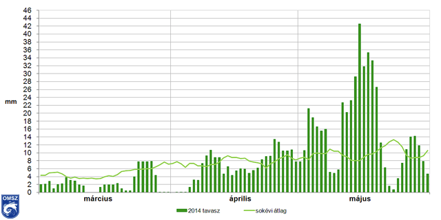 A tavasz első fele országos viszonylatban szárazabb volt a megszokottnál, márciusban, területi átlagban a normál mennyiség 46%-át jegyeztük. Ezzel együtt a tavasz csapadék mérlege pozitívnak bizonyult; a sokéves átlagnál 13.7 %-kal több eső esett. Az ilyenkor szokásosnál csak a középső részeken hullott kevesebb csapadék. Az ország északi és déli határszélein mértünk több csapadékot, amely a sokéves átlagot is meghaladta. A legnagyobb napi csapadékösszeget, 95.2 mm-t május 3-án Verpelétről jelentették.