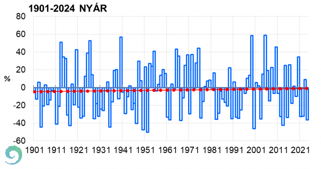 Az országos évszakos csapadékösszegekhez illesztett exponenciális trend alapján 1901 óta minimális növekedés tapasztalható (8. ábra), de ez a változás statisztikai értelemben nem szignifikáns. 2024 nyara szárazabb volt, mint a sokéves átlag, ahogyan az elmúlt 4 évből 3 év nyara. Csak 2023-ban volt a megszokottnál kissé nedvesebb (9%-kal) a nyár.