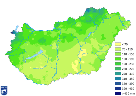 A nyári csapadékösszeg eloszlását tekintve (6. ábra) É-D irányú csökkenést figyelhetünk meg. Az ország legnagyobb részén 70-190 mm közötti értékeket regisztráltunk. A legkevesebb esőt Csongrád, Jász-Nagykun-Szolnok és Somogy megye kisebb területei kapták, itt a háromhavi csapadékösszeg nem érte el a 70 mm-t. A legtöbb eső az ország ÉNy-i csücskében, Sopronban hullott (442.3 mm), a második legcsapadékosabb terület Borsod-Abaúj-Zemplén megye ÉNy-i része, 310-350 mm közötti értékkel.