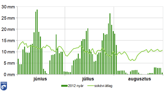 A júniusi, illetve júliusi csapadékösszeg országos átlagban nem kiemelkedő érték, az augusztus azonban rendkívül száraznak bizonyult. Az elmúlt 112 év legszárazabb márciusa után az idei augusztus a legszárazabb augusztus lett ugyanezen időszakot alapul véve.