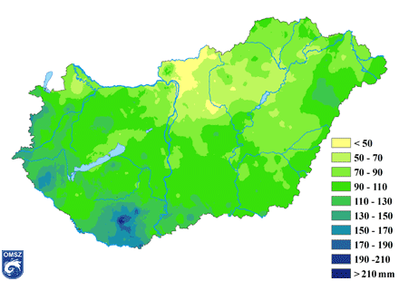 A tavaszi csapadékösszeg térben igen egyenlőtlenül oszlott el hazánkban (6. ábra). A legkevesebb eső Nógrád megye területén hullott, itt az 50 mm-t sem érte el az évszakos csapadékösszeg, míg a Mecsek térségében 200 mm-t meghaladó értékek is előfordultak, illetve az Alpokalján és a Zalai-dombság területén 130-170 mm közötti összegeket mértünk. Az ország többi részén 70-110 mm közti értékek voltak jellemzőek.