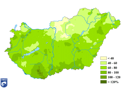 A sokévi átlaghoz viszonyítva az idei csapadékösszegeket, hasonló térbeli eloszlást tapasztaltunk, mint előző térképünkön (7. ábra). Nógrád megye és az Északi-középhegység térsége átlag alatti csapadékot kapott 2012 tavaszán, volt, ahol a normál érték 40%-át sem érte el a csapadékösszeg. Az ország nagy részén 60-80%-os volt ez az arányszám, míg a Mecsek környékén átlagos és átlag feletti területek is kirajzolódtak (100-120%).