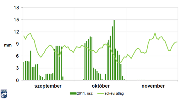 A 2011-es ősz országos átlagban vett, 5 napos csapadékösszegei és a sokévi (1971-2000-es)átlag (mm) - az adott dátumhoz tartozó érték az addig lehullott 5 napos összeget jelöli