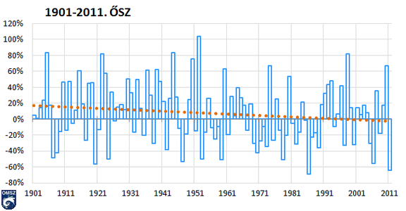 Az országos őszi csapadékösszegek százalékos eltérése a sokéves (1971-2000-es)átlagtól 1901 és 2011 között (interpolált adatok alapján)