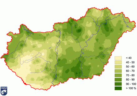 Csupán kis területektől eltekintve az egész ország szárazabb volt az elmúlt évszakban a szokásosnál (7. ábra). A Dunántúl középső részén az értékek 40% alatt maradtak, a csapadékösszegek helyenként a sokéves átlag 1/3-át sem érték el. A Dunától keletre nagyobb arányok jelentkeztek, de a lehullott összeg többnyire csak a Mátrában érte el a szokásos mennyiséget.