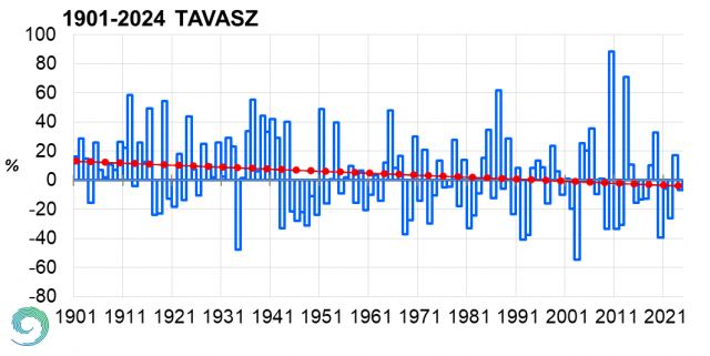 Az országos tavaszi csapadékösszegekhez illesztett exponenciális trend alapján 1901 óta csökkenés tapasztalható (8. ábra). Az elmúlt évszak is szárazabb volt, mint a sokéves átlag, akárcsak az elmúlt 5 évből 4 év tavasza. Csak 2023-ban volt a megszokottnál kissé nedvesebb (17%-kal) a tavasz.