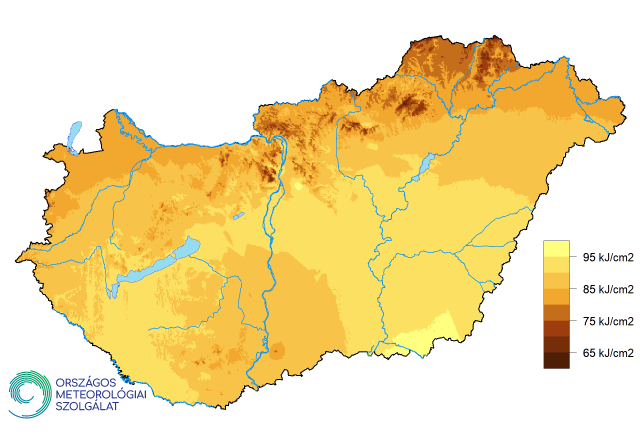 A globálsugárzás értéke 60 és 100 kJ/cm2 között alakult (11. ábra). Az ország legnagyobb részén 85-95 kJ/cm2 volt jellemző. Ennél alacsonyabb értékek csak a Kisalföldön és az ország északi részén, a hegyvidékeken, magasabb értékek délkeleten jelentkeztek.