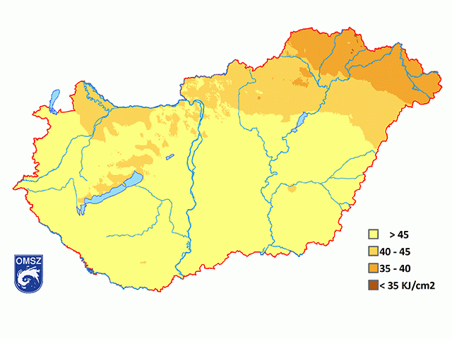 A legalacsonyabb globálsugárzás értékeket az észak - északkeleti országrészben figyelhetjük meg (11. ábra): a Zemplénben 35 kJ/cm2 alatti érték is előfordult. A legtöbb globálsugárzás a Dunántúlon és az Alföld középső-déli részén érkezett (több mint 45 kJ/cm2).