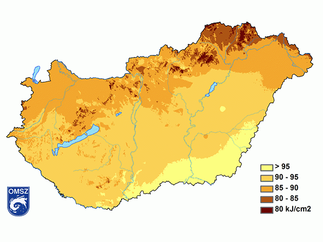 2018 őszének globálsugárzás értékei zömmel 90 és 95 kJ/cm2 között alakultak (11. ábra). A délkeleti országrészben születtek a legmagasabb, 95 kJ/cm2-t meghaladó értékek. A legkisebb globálsugárzás értékek az ország északkeleti részén jelentkeztek, 80-85 kJ/cm2-s értékekkel, míg az Északi-középhegység magasan fekvő részein, különösen a Mátra, Bükk, Aggtelek és a Zempléni-hegység területén ennél alacsonyabb értékek is előfordultak.
