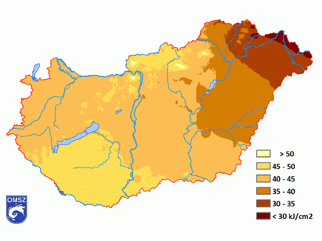 A legalacsonyabb globálsugárzás-értékeket az ÉK-i országrészben figyelhetjük meg (11. ábra): a határ mentén már nem ritka a 35 kJ/cm2 alatti érték sem. A legtöbb globálsugárzást a Dunántúl déli része és egy-egy magasabb hegycsúcs kapta (több mint 50 kJ/cm2).