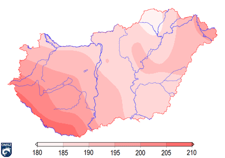 Országos átlagban a nyári globálsugárzás összege általában 185 kJ/cm2 szokott lenni. Ezt az értéket összevetve térképünkkel (11. ábra) látható, hogy az ország területének nagyobb részén ezt meghaladó értékek fordultak elõ. A területi eloszlás délnyugat-északkelet irányú csökkenést mutat, az elõforduló legnagyobb értékek a 210 kJ/cm2-es mennyiséget is meghaladták.