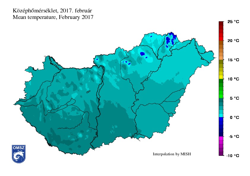 Februárban a középhőmérséklet -2- és +5 °C között alakult hazánkban. A délnyugati országrészben +4 és +5 °C közötti átlagokat jegyeztünk, míg az ország északkeleti területein zömmel fagypont közelében alakultak az értékek. A hónapban a legalacsonyabb hőmérsékletet az Északi-középhegységben, Baskó állomáson (-9,6 °C) rögzítettük. A legmagasabb havi átlaghőmérséklet (4,5 °C) Pécs Egyetem állomáson, a legalacsonyabb (0,0 °C) Kékestető mérőállomáson adódott. Országos átlagban a fagyos napok (Tmin ≤ 0 °C) száma 18 nap, a téli napok (Tmax≤ 0 °C) száma 4 nap volt. A hőmérsékleti küszöbnapok száma 2-3 nappal volt kevesebb, mint az 1981-2010-es normál időszakban.