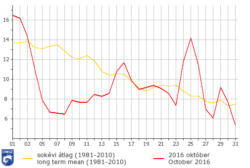 Október eleje meglehetősen melegnek adódott, országos átlagban több mint 2°C-kal múlta felül az 1981-2010-es átlagot. Ezt követően egy hidegfront vonult át hazánk felett, és a mögötte beáramló hideg levegő hatására több fokkal visszaesett a hőmérséklet. A derűs, szélcsendes éjszakák következtében egyes helyeken fagypont alatti hőmérsékleti értékek is jelentkeztek. Október 6-án, Kékestetőn megdőlt az legalacsonyabb országos maximumhőmérséklet napi rekordja, melyet 1912-ben mértek Dobogókőn (3,4°C). Ekkor csupán 0,9°C-ig emelkedett a levegő hőmérséklete. Másnap, október 7-én megismétlődött egy 80 éves fővárosi abszolút minimumhőmérsékleti rekord, Budapest Ferihegy állomáson -0,1°C-ot mértünk. Október 11-én mindössze 0,1°C-kal sikerült megdönteni az 1936-os dobogókői, legalacsonyabb maximumhőmérsékleti rekordot, Kékestetőn csupán 2,9°C-ig emelkedett a hőmérséklet. A hónap közepe a normálérték körül alakult, majd egy melegebb periódusnak köszönhetően a sokévi átlagnál több fokkal magasabb értékek jelentkeztek. Ezt követően felváltva fordultak elő enyhébb és hűvösebb időszakok.