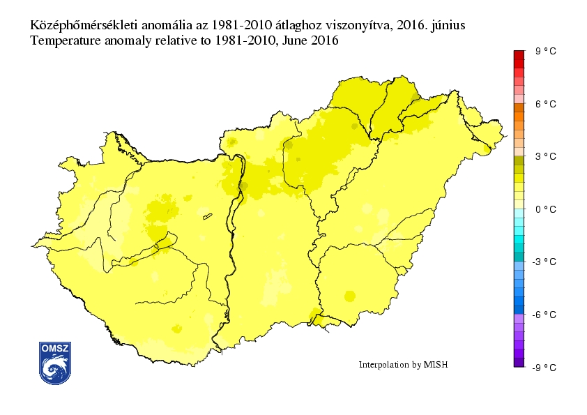 A nyár első hónapjában a havi középhőmérséklet az egész országban a 30 éves normál felett alakult, a Balaton keleti medencéjében, Az Öreg-Bakonyban, Budapest környékén és az Északi-középhegység területén közel 2°C –kal is melegebb volt, mint ahogy egyébként ilyenkor szokásos.