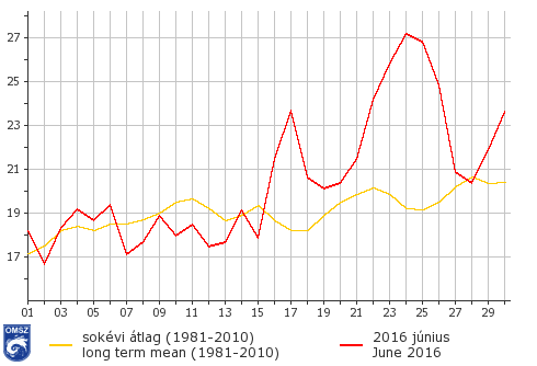 A hónap elején a csapadékos időjárásnak köszönhetően a hőmérséklet a sokéves átlagnak megfelelően, vagy kissé alatta alakult. A június 15-én indult felmelegedésnek egy gyorsan fejlődő viharciklon vetett végett, amelyhez számos felhőszakadás kapcsolódott a keleti országrészben. A hónap végén, június 23. után egy erőteljes anticiklon kiépülésének köszönhetően jóval melegebb periódus következett. Az Országos Meteorológiai Szolgálat előrejelzése alapján az Országos Tisztifőorvos 2016. június 23. (csütörtök) 00 órától 2016. június 26. (vasárnap) 24 óráig II. fokú hőségriasztást adott ki. Országos átlagban ezeken a napokon 25 °C felett alakult a napi átlaghőmérséklet, sok helyen még az éjszakai órákban sem csökkent a minimum hőmérséklet 25 °C alá. A hőségnek egy markáns hidegfront vetett véget.