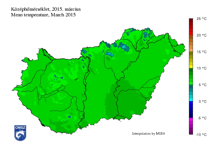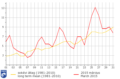 A március melegebben kezdődött a megszokottnál, és a hónap nagy részében átlag feletti hőmérséklet volt jellemző. Csupán néhány napig tartó időszakokban maradt a napi középhőmérséklet az országos átlag alatt. A leghidegebb napon (március 7.) országos átlagban 2,6°C volt középhőmérséklet, ami mindössze 0,3°C-kal maradt el az 1981-2010-es normál értéktől. A legmelegebb napon (március 26.) 12,9°C-ot mértünk, mely közel 5°C-kal haladta meg az országos átlagot.