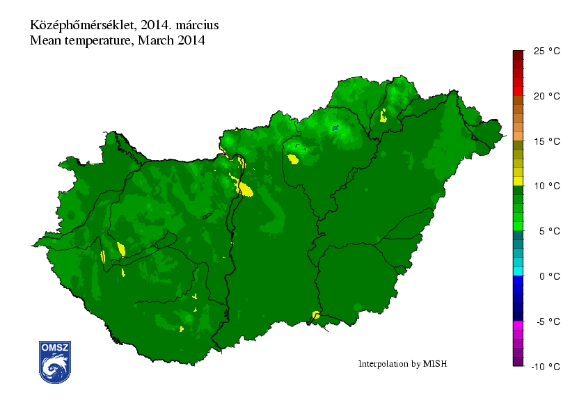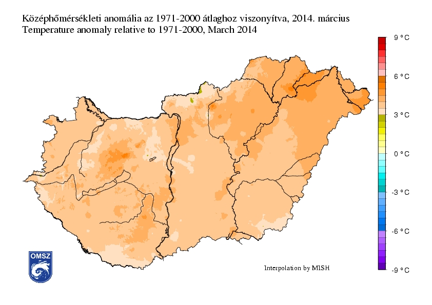 2014 márciusa jelentősen melegebbnek bizonyult a megszokottnál: az országban sehol sem volt hűvösebb a harmincéves átlagnál, a legnagyobb részen a havi átlaghőmérséklet a sokéves normálnál 3,5-4,5 °C-kal is magasabbnak adódott. Az ÉK-i régióban és a Dunántúli-középhegységben alakult ki a legnagyobb pozitív anomália, itt átlagban 4,5-5,5 °C-kal is melegebb volt a szokásosnál.