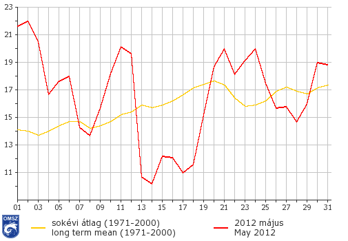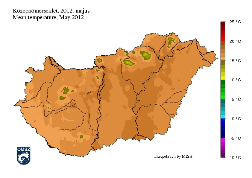 A középhőmérsékleti anomália térképen láthatjuk, hogy május hónap hazánkban az 1971-2000-es normálhoz viszonyítva valamivel melegebb volt, kivétel egy kisebb területet a déli határvidéken, ahol 0 és -1 °C közötti volt a különbség. Az ország déli és keleti felében 0-2 °C-os pozitív anomáliák rajzolódtak ki, míg északon ennél magasabb, 2-3 °C közötti volt a különbség, illetve a főváros térségében és hegységeink egyes területein 3-4 °C-kal is meghaladták az idei értékek a sokéves átlagokat.