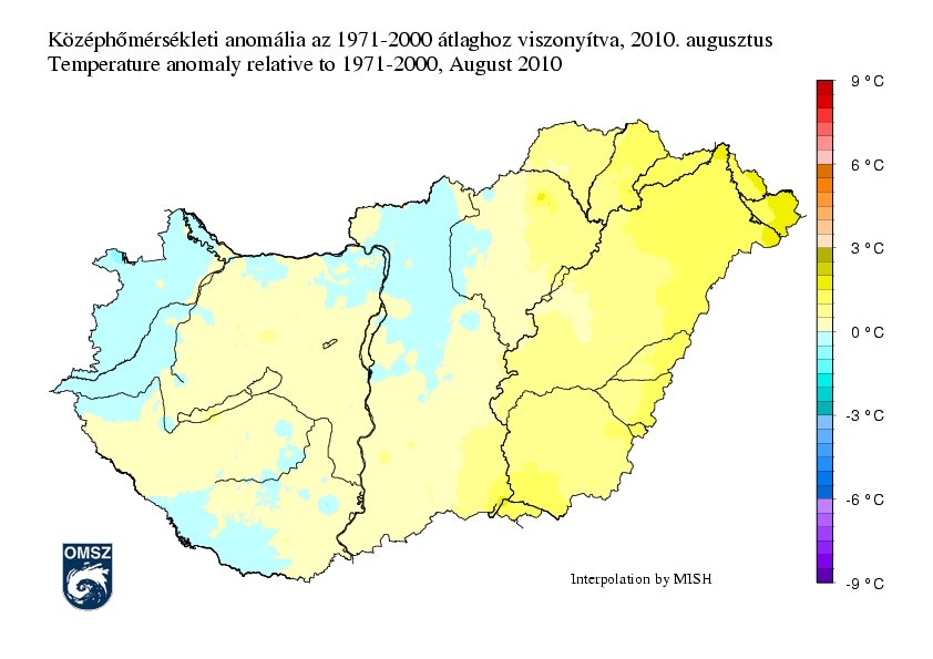 Az utolsó nyári hónap középhőmérséklete hazánk jelentős részén meghaladta az ilyenkor szokásos értékeket. A legnagyobb pozitív anomália (1,5 - 2 fok) keleten, délkeleten volt. Az ország középső, valamint a Dunántúl nagyobb részén a középhőmérséklet kevéssel a sokévi átlag felett alakult. Az átlagosnál hűvösebb volt délnyugaton, az északnyugati országrészben, illetve a Gödöllői-dombság és a Cserhát térségében.