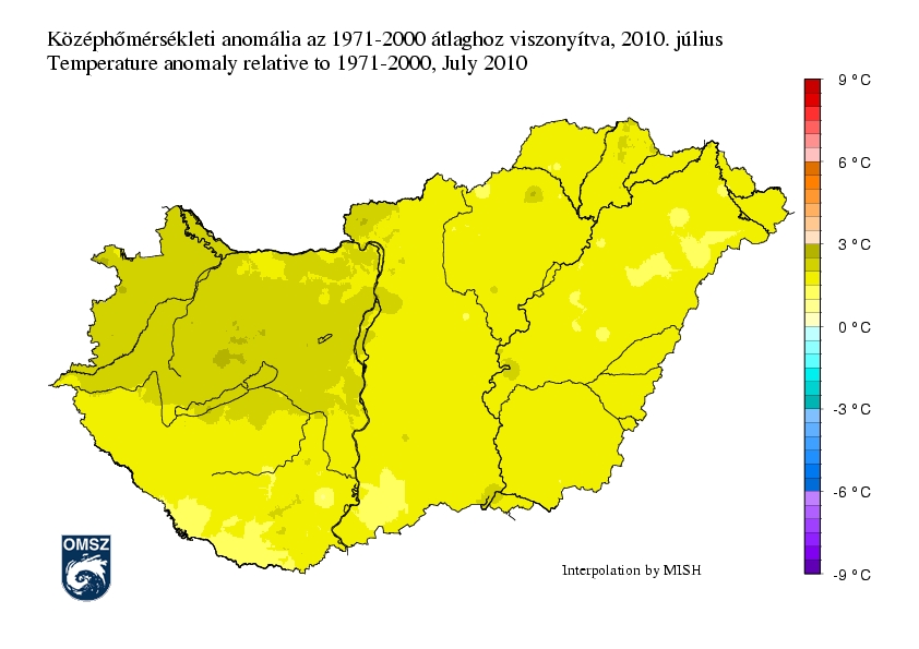 Bár a hónap első napjaiban a szokásosnál melegebb volt, a 2-án kezdődött lassú lehűlés következtében a napi középhőmérséklet országos átlaga 4-én már a sokévi átlag alá csökkent. A hűvös periódus csúcspontja 7-én volt, ekkor mintegy 3 fokkal volt hidegebb, mint ahogy az ilyenkor megszokott. Ezt követően jelentős melegedés vette kezdetét. A hónap nagy részében a sokévi átlagot jóval meghaladó átlaghőmérséklet volt jellemző. A meleg periódus két csúcsa 17-én és 23-án volt, amikor a pozitív anomália elérte a 6, illetve az 5 fokot. Július 23-a után drasztikusan megváltozott a hőmérsékleti kép. 25-én országos átlagban a középhőmérséklet már 5 fokkal elmaradt az ilyenkor szokásos értéktől. A hónap hátralévő napjain bár lassú melegedés kezdődött, az átlaghőmérsékletek rendre elmaradtak a sokévi átlagtól.