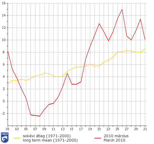 Bár az első tavaszi hónap a szokásosnál melegebb idővel érkezett, a napi középhőmérsékletek a március 3-tól 17-ig terjedő időszakban a sokévi átlagnál lényegesen alacsonyabbak voltak. A március 17-én kezdődő folyamatos és intenzív melegedés következtében a napi középhőmérsékletek a hónap második felében országos átlagban már újra meghaladták az ilyenkor szokásos értékeket.