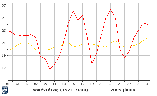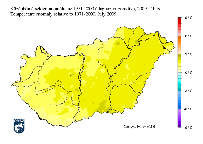 Az ország teljese területén pozitív hőmérsékleti anomália adódott július hónapban. Főként az alföldi területeken az eltérés mértéke 1,5 - 2 °C közöttinek adódott. Az ország többi részén a havi középhőmérséklet 1 – 1,5 fokkal volt a sokévi átlag felett.