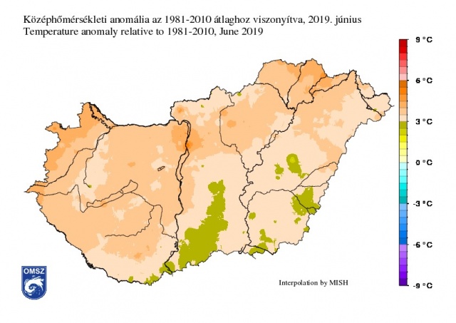 2019 júniusa a legmelegebb volt 1901 óta. Országosan közel átlagos mennyiségű csapadék érkezett, azonban több helyen a felhőszakadások és a viharok jelentős károkat okoztak.