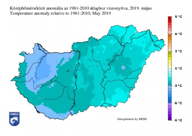 A májusi havi középhőmérséklet jócskán elmaradt a szokásostól. Az ország nagy részén jellemzően 16°C körül alakul a havi középérték, idén viszont sehol nem érte el a májusi átlag a 16°C-ot, még a 15°C-ot is csak néhol haladta meg délkeleten, illetve Budapest belvárosában, összesen 6 állomáson, azokon is csupán 1-2 tizedfokkal. Nyugat felé haladva egyre hűvösebb volt a hónap. A Dunától keletre, az Alföldön még 14–15°C, a Dunántúl keleti, délkeleti részén már csak 13–14°C, a Nyugat-Dunántúlon, a Kisalföldön viszont mindössze 12–13°C közötti középhőmérsékletű volt a 2019-es május. A magasabb hegyeken még a 10°C-ot sem érte el a hónap középhőmérséklete, a leghidegebb a Kékesen volt (8,3°C). A hegyi állomásokon kívül (400 m alatt) Szentgotthárd Farkasfán lett a leghűvösebb a május (12,1°C).