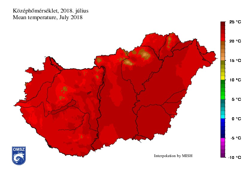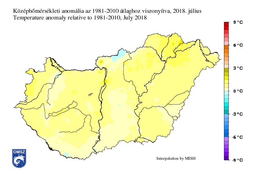 A szokásosnál 0,7 °C-kal volt melegebb a nyár második hónapja az 1981-2010-es átlaghoz képest. Az országos átlagban 21,9 °C havi középhőmérséklet valójában jelentősen elmaradt az eddigi legmelegebbnek számító 23,4 °C (2015) júliusi értéktől. Az anomália térképre tekintve a szokásostól vett legnagyobb hőmérsékleti eltérést Budapest és a Dunakanyar térségében, illetve a Bodrog mentén azonosíthatjuk. Itt a havi középhőmérséklet eltérése az 1981-2010-es átlagtól meghaladta a 2 °C-ot. Ugyanakkor a júliusi havi középhőmérséklet Nógrád megye északi részén elmaradt a szokásostól.