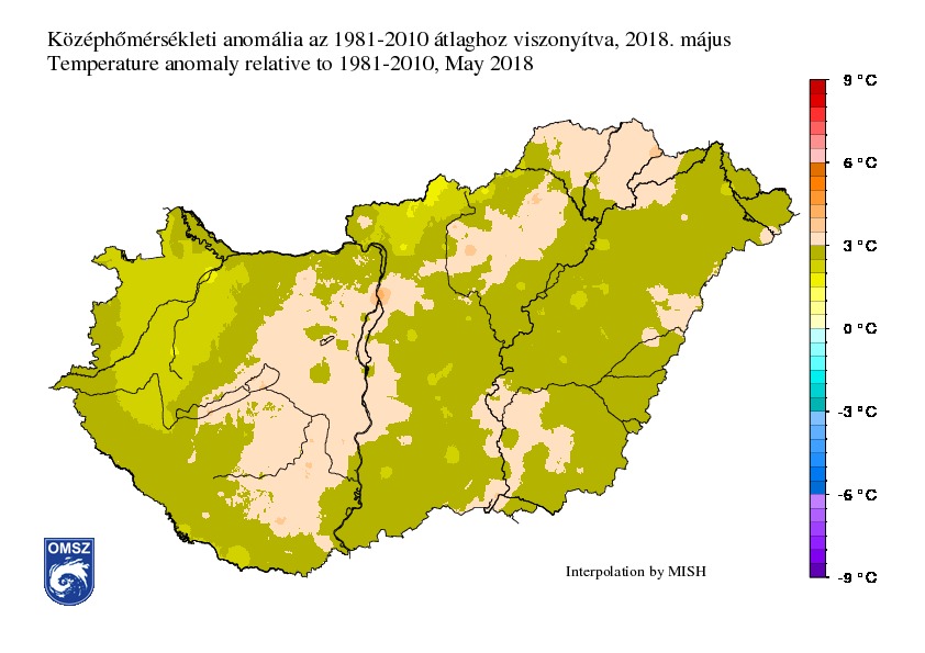 A szokásosnál 2,9°C-kal volt melegebb az idei május az 1981-2010-es átlaghoz képest és ezzel a 3. legmelegebbnek adódott 1901 óta. Csupán 0,1°C-kal maradt el a valaha mért legmelegebb májusi középhőmérséklettől, melyet 2003-ban mértünk. Az anomália térképet tekintve látható, hogy sehol nem jelentkezett átlagosnál alacsonyabb érték. A legmelegebb területek foltokban jelentkeztek, a Dunántúl tágabb környezetében, az Északi-középhegység területén, a Dél-Alföldön, valamint Budapest környékén. A legnagyobb pozitív anomália értéke meghaladta a 3°C-ot is.