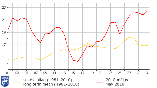 A hónap jelentős részében átlag feletti hőmérsékleti értékeket mértünk. Május elején kora nyárias időnek örülhettünk, 20°C-ot meghaladó értékek adódtak országos átlagban. Május 4-én megdőlt az országos melegrekord, Edelényben 32,3°C-ig emelkedett a levegő hőmérséklete. A korábbi rekordot Kaposváron jegyeztük, 1946-ban 32°C-kal. Május közepén a hazánktól északkeletre és délnyugatra lévő hidegörvények együttes hatására hűvösebb és csapadékosabb lett az időjárás, ennek eredményeképpen átlag alatti értékek fordultak elő. Ezt követően már melegebb léghullámok határozták meg a Kárpát-medence időjárását, átlag feletti értékeket eredményezve. A hónapban 18 nyári napot (Tmax ≥ 25°C) és 2 hőség napot jegyeztünk (Tmax ≥ 30°C), a sokéves átlag ezzel szemben 9 és 1 nap.