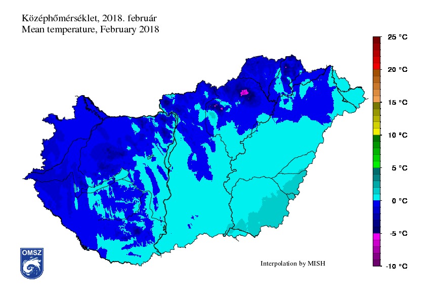 Februárban a középhőmérséklet -5 és +1 °C között alakult hazánkban. A Mátrában és a Bükkben -5 °C alatt, a Dunántúl nagy részén pedig fagypont alatt maradt a havi átlaghőmérséklet. Az Alföldön és különösen a délkeleti országrészben jellemzően fagypont feletti átlagok adódtak. A hónapban a legmagasabb havi átlaghőmérséklet (1,5 °C) Szeged belterület állomáson, a legalacsonyabb (-5,7 °C) Kékestető mérőállomáson adódott.